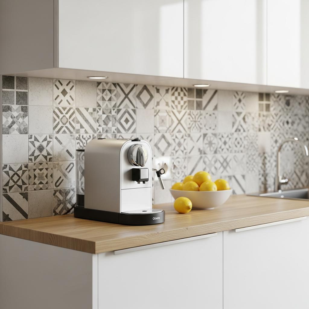 La crédence est l’endroit idéal pour oser un motif fort sans surcharger la pièce. Le carrelage imitation ciment y apporte du caractère tout en offrant une surface parfaitement résistante aux projections et facile à nettoyer.